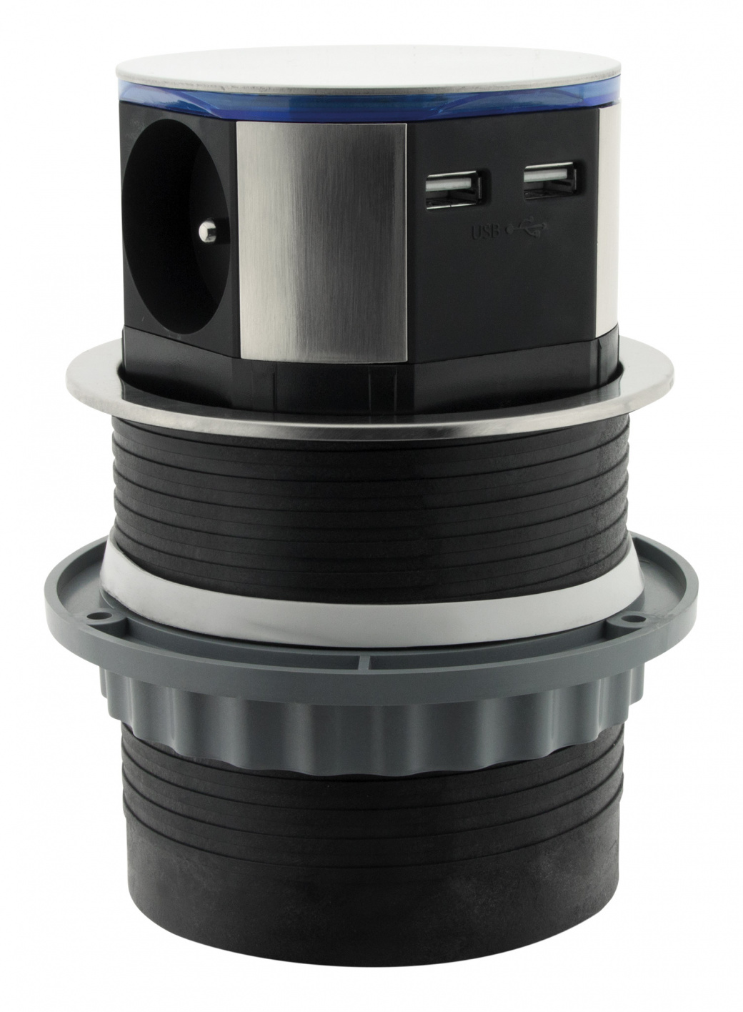 Bloc encastrable en plusieurs coloris pour cuisine et bureau équipé de toutes les prises nécessaires. Compacte et facile à installer, cette prise encastrable est équipée d'un système d'ouverture automatique par simple pression. Son faible encombrement permet de l'installer sans contrainte de place sous le bureau ou sur le plan de travail dans un trou de diamètre Ø100mm. S'installe à l'aide d'une scie cloche ou d'un trépan mais également à l'aide d'une simple perceuse grâce au gabarit de pose fourni (bague de fixation). Câblée en H05VV-F 3G1,5mm² de longueur 1,5m. Puissance max 3680 W sous 230 W. Dimensions du produit ouvert : Ø 16 x 11.5 cm. Dimensions du produit fermé (prises non visibles) : Ø 10.3 x 11.5 cm.