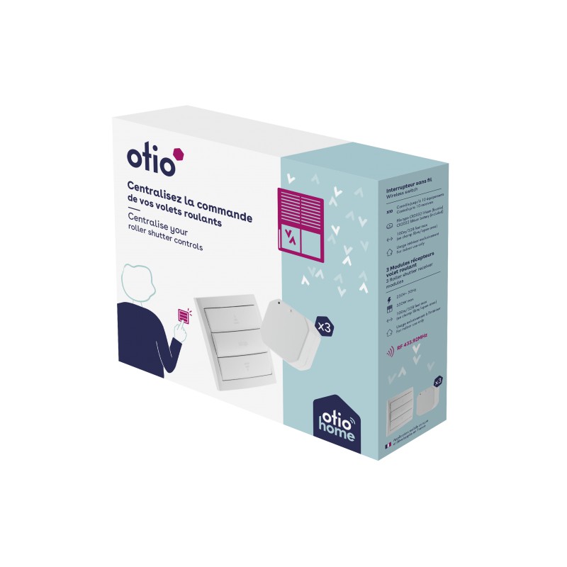 Entrez dans l'univers OtioHome et expérimentez la maison connectée ! Grâce à son application mobile unique et à sa gamme de produits connectés complète, OtioHome vous permet de piloter tous les objets du domicile par télécommande, smartphone ou assistant vocal. OtioHome est compatible avec les assistants vocaux Google Home et Amazon Alexa. Chez vous ou à l'extérieur, allumez, éteignez et programmez vos appareils électriques, vos éclairages et vos volets roulants en toute simplicité. L'application mobile unique vous permet de connecter votre maison en quelques clics. La mise en route et l'appairage des objets appartenant à la gamme OtioHome se font de manière simple et intuitive grâce à des tutoriels disponibles gratuitement sur l'application mobile. L'application OtioHome a été conçue et développée en France afin de garantir un traitement sécurisé des données dès la phase de conception (conforme RGPD). Grâce à ce pack connecté pour volets roulants, vous pourrez commander l'ouverture et la fermeture de vos volets roulants depuis votre domicile de manière centralisée. A distance, vous pourrez aussi le faire grâce à l'application mobile OtioHome associée à la passerelle (751170). Très pratique, ce pack vous permet de contrôler jusqu'à 10 équipements avec une même commande centralisée. Facile et rapide à installer, cet ensemble connecté est compatible avec Google Home. Installation: Le module s'installe directement sur votre interrupteur existant, il ne modifie en rien votre installation et permet le maintien de la commande unitaire des volets par vos interrupteurs. L'interrupteur centralisé sans fil se place n'importe où dans votre logement et vous permet de piloter d'un seul geste l'ensemble de vos stores ou volets. Caractéristiques de l'interrupteur de commande sans fil Portée : 100 m en champ libre, Fréquence RF : 433,92 MHz, Alimentation : 1 pile type CR2032 (fournie). Caractéristiques des modules: Portée : 100 m en champ libre, Fréquence RF : 433,92 MHz, Alimentation : 220V~ 50Hz, Puissance : 350W max.
